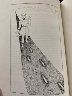 The New Year is just over a week old and already those New Year resolutions feel so old that I can barely recall them. January 1st. started off with such great intentions but today I have trouble facing them head on! Maybe next New Year I will do better and make it into the third week before forgetting! It’s a strange thing that we can only make resolutions at the beginning of a year and never during its course. Why would I wish to change this habit? The illustration above is by Lonni Sue Johnson from the book Parables of Kierkegaard edited by Thomas C. Oden. It accompanies Kierkegaard’s parable about the man who walks backwards while all along looking face on at the one from whom he is walking thus giving the appearance that his intention is to come to the person while actually walking away! The more he walks the greater he has to express intention but the only result is despondency.