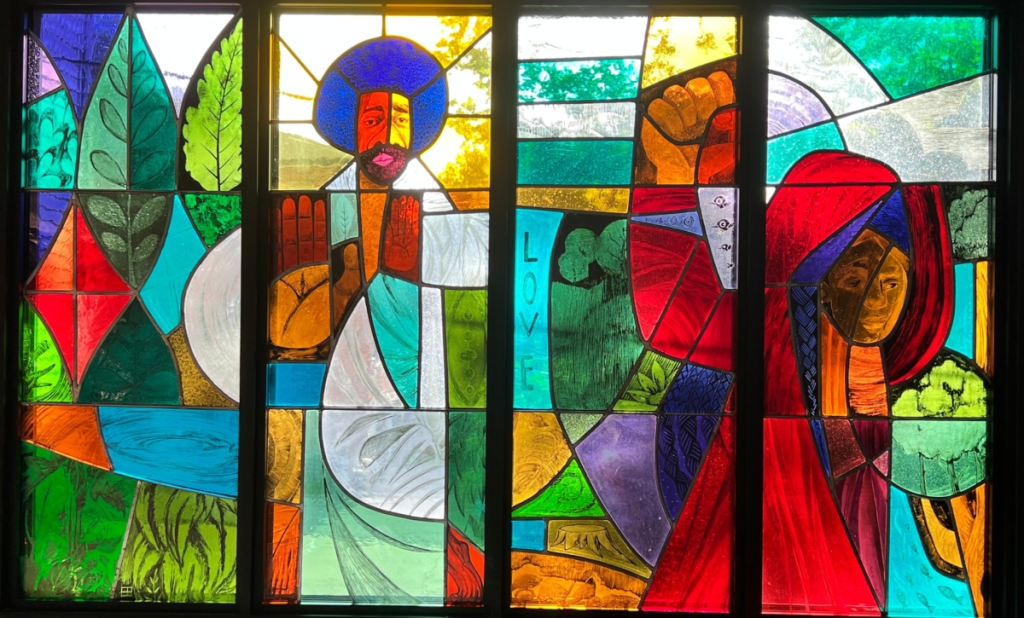 “Rise Up,” a stained glass window bank by Cbabi Bayoc at the Episcopal Church of the Holy Communion in University City, Missouri. Photo source: Episcopal Church of the Holy Communio